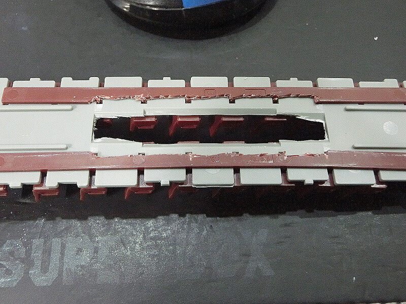車体の室内全体が音響箱になりますので、クーラーの隙間から若干音を漏れるようにするため、中央付近の屋根板と車体の天井板に穴あけします。見えない部分なので綺麗に仕上げることなく、開けたまま、少しバリ取りをした程度です。形状を整えるというような無駄な作業はしません。