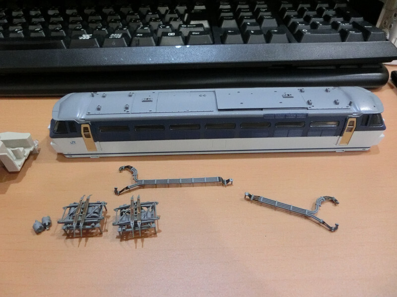 パンタグラフは小物を取り付けた最後に復帰する予定。今回は製品のパンタを塗装して再利用することにしました。